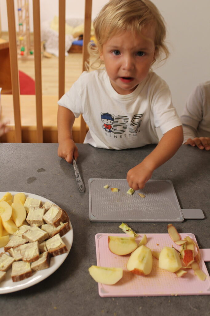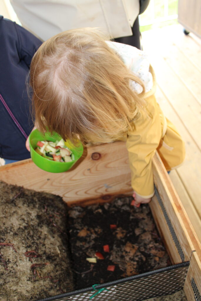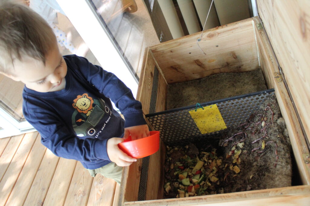 Seit einigen Wochen steht sie auf unserer Terrasse. Jeden Tag hat ein Kind aus jeder Gruppe die Aufgabe, die Reste der Jausenzubereitung klein zu schneiden und anschließend die Würmer damit zu versorgen.
