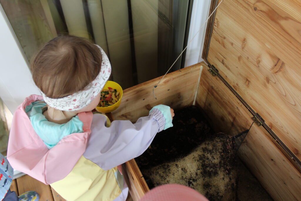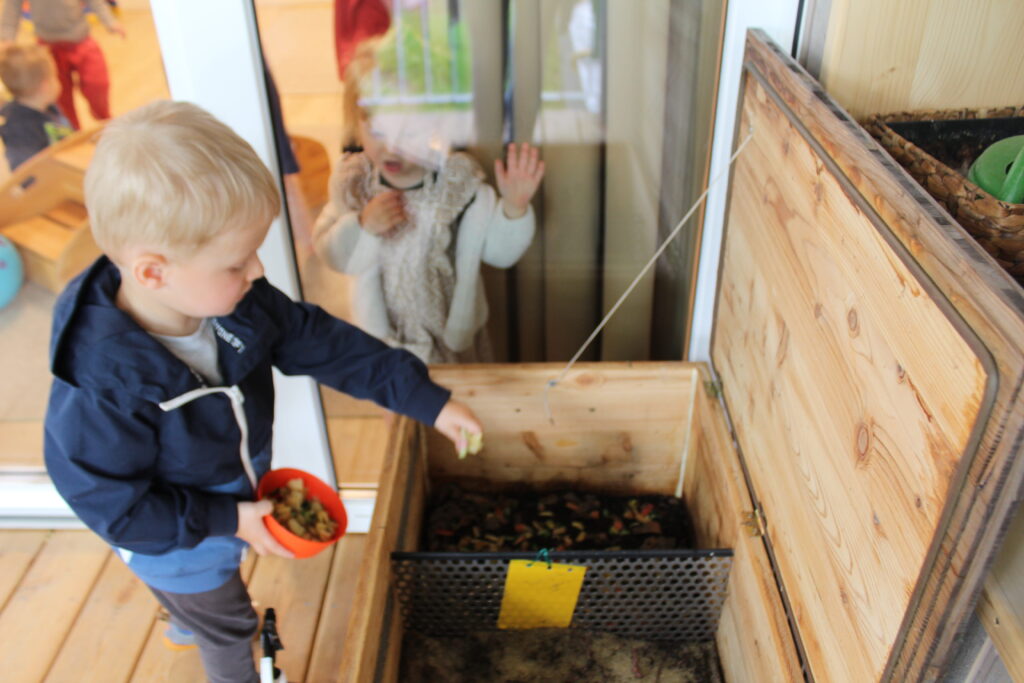 Aus der Überlegung heraus, wie wir den Kindern einen achtsamen Umgang mit unseren Ressourcen und gleichzeitig auch den Kreislauf der Natur näher bringen können, wurde das Projekt “Wurmkiste” ins Leben gerufen.